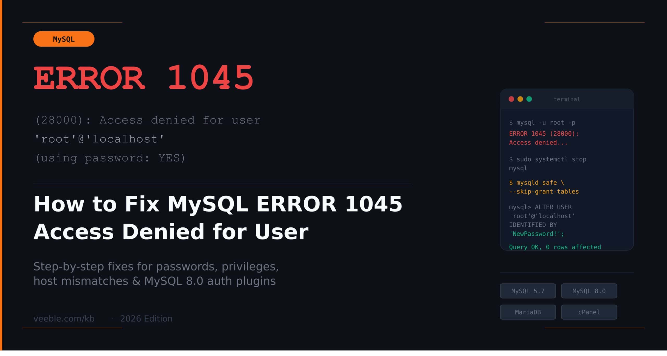 This article covers the most common causes of ERROR 1045 and walks through the exact commands to fix each one on Linux servers running MySQL 5.7, MySQL 8.0, and MariaDB.